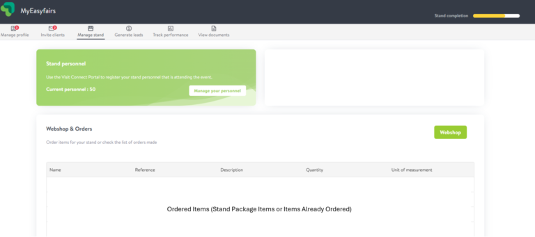When scrolling on the ‘Manage Stand’ page you should see the list of your items (this includes those in your stand package and any items ordered), as well as a green icon named ‘Webshop’. Click on this green button to access the webshop.