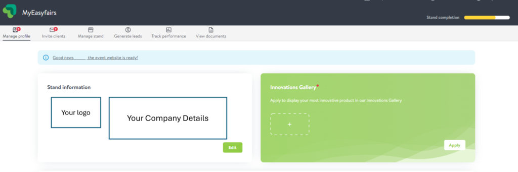 First log in to your MyEasyfairs account, then select ‘Manage Stand’ for your stand at DAS 2026. If you have not set up your account, this will say ‘set up stand’. Please click this and complete setting up your stand.